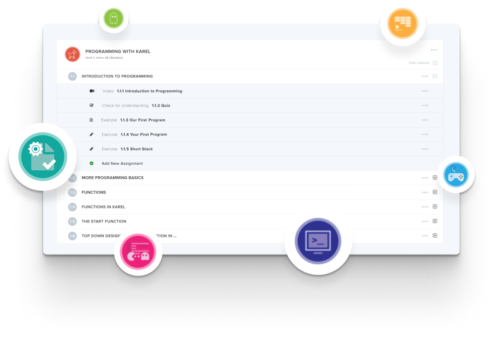 Create and organize Assignments in any CodeHS course that you're teaching. You can even add custom assignments to pre-existing CodeHS courses.